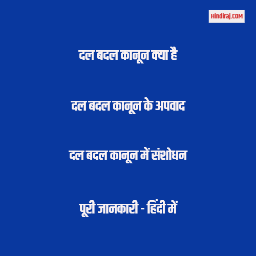 यह कानून 1985 में अस्तित्व में आया और इससे पहले इस प्रकार का कोई कानून हमारे संविधान (Constitution) में नहीं था | इसलिए यदि आपको दल बदल कानून (ANTI-DEFECTION LAW) के विषय में अधिक जानकारी नहीं प्राप्त है और आप इसके विषय में जानना चाहते है, तो यहाँ पर आपको दल बदल कानून (Anti-Defection Law) क्या है? | अधिनियम, नियम व संशोधन की जानकारी दी जा रही है |