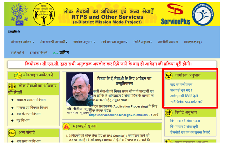 बिहार RTPS पोर्टल पर उपलब्ध सेवाएं