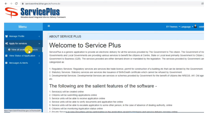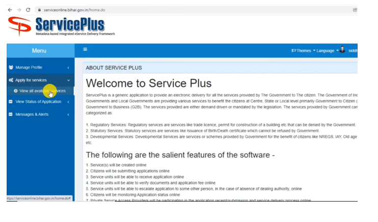 • अब आप के सामने एक नया पेज ओपन हो जाएगा जिसके मेन्यू बार में आपको Apply for Services का विकल्प दिख रहा होगा। इसपर क्लिक करें।