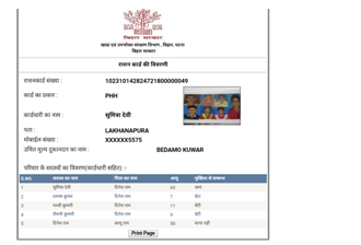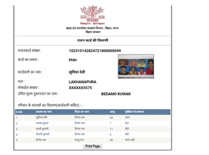 - अब राशन कार्ड आपकी स्क्रीन पर आ चुका है। अब आप चाहे तो इसे print page ऑप्शन पर क्लिक करके डाउनलोड कर सकते हैं या फिर इसे पीडीएफ फॉर्मेट में सेव भी कर सकते हैं।