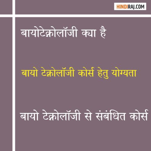 बायो टेक्नोलॉजी को बायोटेक के नाम से भी जाना जाता है और बायोटेक्नोलॉजी को हिंदी भाषा में जैव प्रौद्योगिकी कहा जाता है। बायो टेक्नोलॉजी एक प्रकार का कोर्स होता है जिसमें टेक्नोलॉजी और जैविकता के मिश्रण से स्वास्थ्य संबंधी ऐसे प्रोडक्ट का विकास किया जाता है जो इंसानों के काम आ सके।