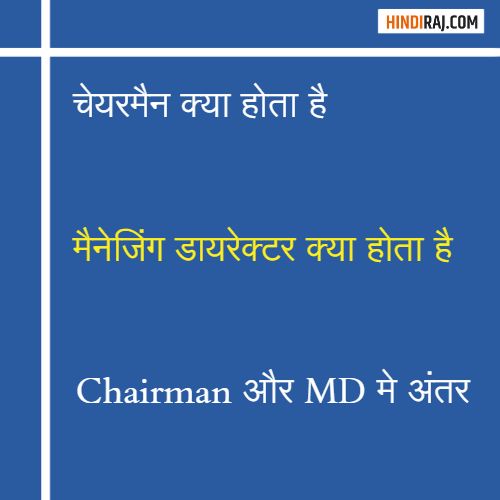 आज हम इस लेख में आपको बताएंगे की किसी भी Company मे चेयरमैन और मैनेजिंग डायरेक्टर कोन होता है? और उनके क्या क्या कार्य होते है और इन दोनो पदो के बीच क्या अंतर होता है चूंकि किसी भी बड़ी कम्पनी के लिए Chairman और MD पद बहुत आवश्यक होते हैं कई बार देखा गया है की एक ही व्यक्ति किसी Company की दो बड़ी पदों पर नियुक्त होते है। लेकिन जितनी भी बड़ी मल्टीनेशनल कंपनीया है जैसे की Google, Amazon, Facebook, Apple इनका स्ट्रक्चर कुछ इस प्रकार होता है की वो हर पद के लिए अलग उम्मीदवार को नियुक्त करते है।