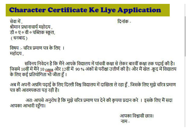 अब आपको एप्लिकेशन लिखनी है जिसमें सबसे पहले आपको बताना है आपने इस स्कूल/कॉलेज में कौनसी कक्षा तक पढ़ाई की है और अपने बारे में थोड़ी जानकारी देनी है। इसके बाद आपको चरित्र प्रमाण की आव्यशकता का कारण लिखना है और आवेदन करना है। अंत में आपको अपना नाम लिखकर एप्लिकेशन को स्कूल/कॉलेज के प्रधानाचार्य को दे देनी है। निम्न तस्वीर में एप्लिकेशन का आप सैंपल भी देख सकते हैं।