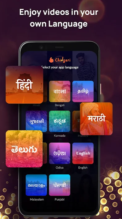 - चिंगारी ऐप विभिन्न भाषाओं हिंदी, अंग्रेजी, बंगला, गुजराती, मराठी, कन्नड़, पंजाबी, मलयालम, तमिल और तेलुगु में उपलब्ध है |
