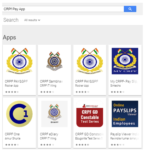 गूगल प्ले स्टोर के सर्च बार में CRPf Pay App लिखकर सर्च करे |