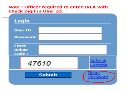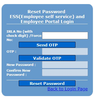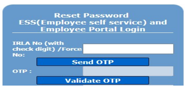 • अब आपके सामने पासवर्ड रिसेट करने के लिए एक फॉर्म ओपन होगा, जिसमें आपको IRLA No दर्ज कर Send OTP के आप्शन पर क्लिक करना होगा |