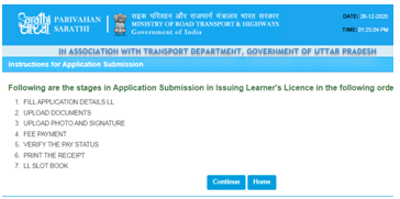 - Apply Learners Licence पर क्लिक करते ही आपके सामने एक नया पेज ओपन होगा, जिसमें आपको इसके प्रोसेस से सम्बंधित जानकारी दी जाएगी, इन सभी आप्शन को पढ़नें के पश्चात Continue पर क्लिक करना होगा |