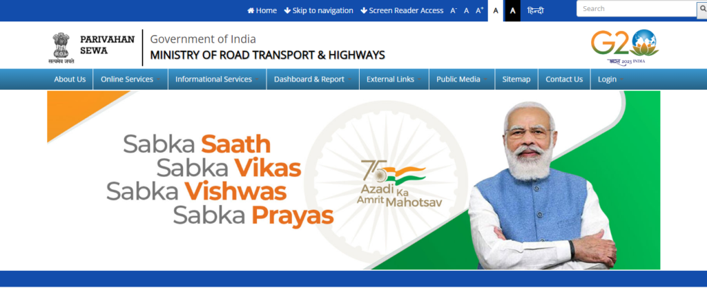 - सबसे पहले आपको भारत सरकार की परिवहन विभाग की आधिकारिक वेबसाइट पर जाना होगा। जिसके बाद आपकी स्क्रीन पर होमपेज खुल जाएगा।