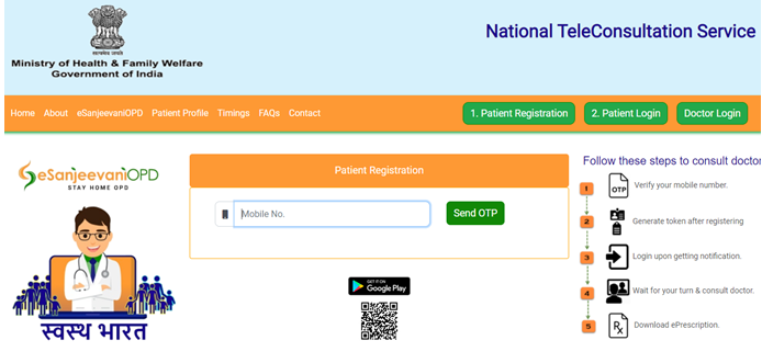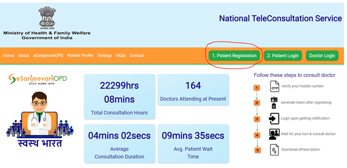• ई-संजीवनी पोर्टल पर पंजीकरण के लिए सर्वप्रथम आधिकारिक वेबसाइट https://esanjeevaniopd.in/Home पर जाना होगा |