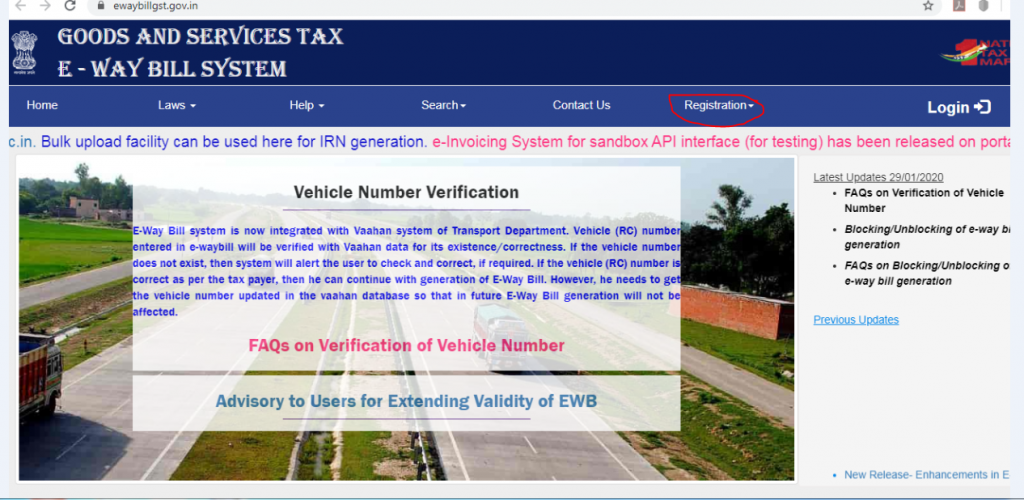 - ई-वे बिल पोर्टल के होम पेज पर रजिस्ट्रेशन लिंक पर क्लिक करे
