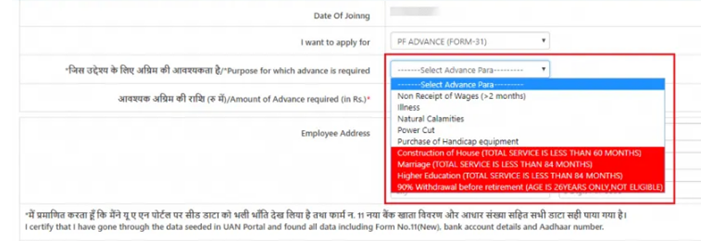 - ऑनलाइन पैसे निकालनें के लिएमैं इसके लिए आवेदन करना चाहता हूं विकल्प के के बगल में दिए गए ड्रॉप-डाउन मेनू से पीएफ एडवांस (फॉर्म – 31) विकल्प चुनें।