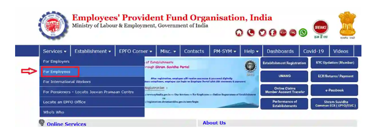 - होम पेज पर Our Services के अन्दर For Employees पर क्लिक करे |