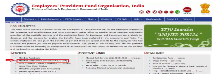 - अब आपके सामनें नया पेज पेज ओपन होगा, यहाँ आपको Member UAN/Online Service (OCS/OTCP) के अन्दर For Employees पर क्लिक करे |