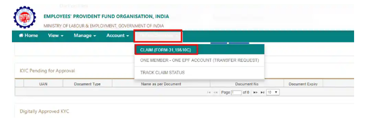 - केवाईसी से सम्बंधित डिटेल सही होनें पर आपको Online Services टैब पर क्लिक करनें के पश्चात Drop down menu में CLAIM (FORM-31, 19 &10C) पर विकल्प पर क्लिक करें।