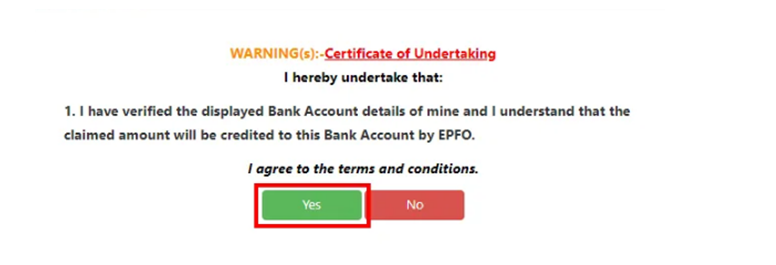 - बैंक खाते के सत्यापन के बादएक Certificate of Undertaking जेनरेट होगा, आपको यहाँ Yes के आप्शन पर क्लिक करने का बाद “Proceed for Online Claim” विकल्प पर क्लिक करें |