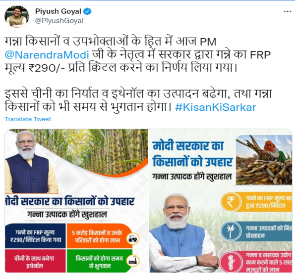 गन्ना एफआरपी (FRP) प्रति की बात की जाये तो प्रतिवर्ष इसका रेट बढ़ता रहता है, लेकिन वर्तमान समय में वित्त मंत्री पीयूषगोयल जी ने बताया है, कि किसानों के संरक्षण हेतु केंद्र सरकार ने यह निर्णय लिया है, कि रिकवरी 9.5 प्रतिशत से नीचे पायी जाने पर किसी भी प्रकार की कटौती नहीं होगी | इसके अलावा उन्होंने बताया कि वो गन्ना किसान जो चल रहे गन्ना सत्र 2020-21 के मूल्य 270.75 रुपये प्रति क्विंटल में बढ़ोत्तरी करके 2021-22 के नए स्ट्रा में 275.50 रुपये प्रति क्विंटल कर दिया है |