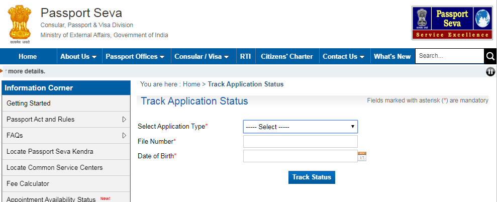 • फिर आपको स्टेटस ट्रैकर पेज पर जाना होगा, जहां आपको अपना फाइल नंबर, पहला और आखिरी नाम, आवेदन करने की तिथि, पासपोर्ट करेंट स्टेटस के बारे में  पूरी जानकारी भरनी होगी |
