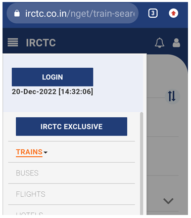 2: आईआरसीटीसी की आधिकारिक वेबसाइट पर जाने के पश्चात आपको दाहिनी तरफ ऊपर की साइड जो तीन टेडी लाइन दिखाई दे रही है, उस पर क्लिक करना है, उसके बाद आपको लॉगइन वाली बटन पर क्लिक कर देना है।