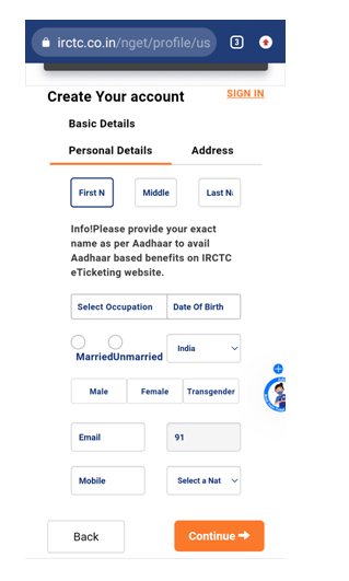 5: आपके द्वारा ऊपर दी गई सभी जानकारियों को भरने के बाद नीचे जो नारंगी रंग के बॉक्स में कंटिन्यू वाली बटन दिखाई दे रही है, उस पर क्लिक कर देना होता है। ऐसा करने पर आपकी स्क्रीन पर कुछ पर्सनल डिटेल्स भरने वाला पेज ओपन हो करके आ जाता है।