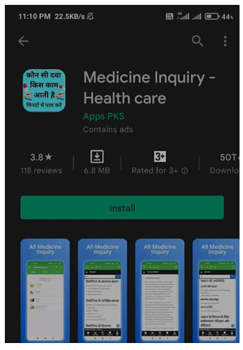 - आपके सामने बहुत सारे एप show होने लग जाएंगे जिसमें से आपको सबसे ऊपर के एप Medicine Inquiry – Health care पर क्लिक करना है।