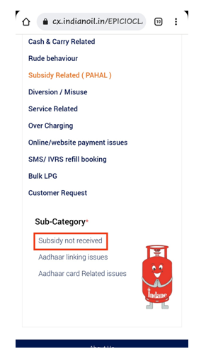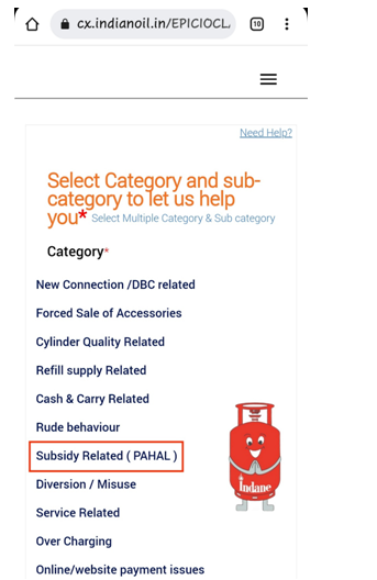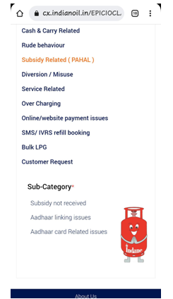 - LPG पर क्लिक करने के बाद आपको नए पेज पर select category and sub category to let us help you यानी हमें आपकी मदद करने के लिए श्रेणी और उप श्रेणी का चयन करें। करके एक लिस्ट आती है।