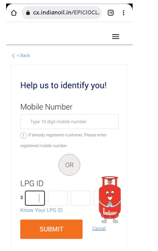 - यहाँ आपको दो ऑप्शन मिलेंगे, 1. मोबाइल नंबर और 2. LPG ID. दोनों में से कोई एक डिटेल्स डालकर Submit बटन पर क्लिक करें |