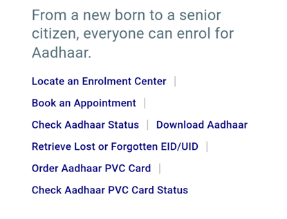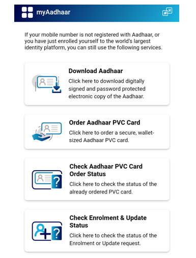 • वेबसाइट ओपन होने के पश्चात आपको स्क्रॉल डाउन करके थोड़ा सा नीचे आना है। नीचे आने पर आपको get aadhar वाला सेक्शन मिलेगा और उसी के नीचे आपको विभिन्न प्रकार के ऑप्शन दिखाई देंगे। उन ऑप्शन में से आपको Download aadhar वाले ऑप्शन पर क्लिक कर देना है।