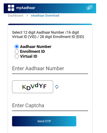 • अब आपको नीचे बताए गए तीन ऑप्शन अपनी स्क्रीन पर दिखाई देंगे। इन तीनों ऑप्शन में से किसी भी एक ऑप्शन का इस्तेमाल करके आप आधार कार्ड को डाउनलोड कर सकते हैं। फिलहाल हम आधार कार्ड वाले ऑप्शन का सिलेक्शन कर रहे हैं।