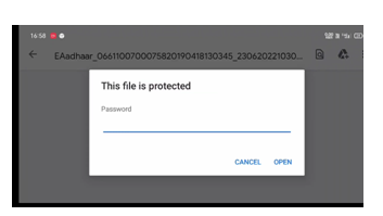 • अब आपको डाउनलोड हुए आधार कार्ड की फाइल के ऊपर क्लिक करना है। फाइल के ऊपर क्लिक करने के पश्चात आपसे पासवर्ड मांगा जाएगा। पासवर्ड डालने के बाद open बटन पर क्लिक करना है।