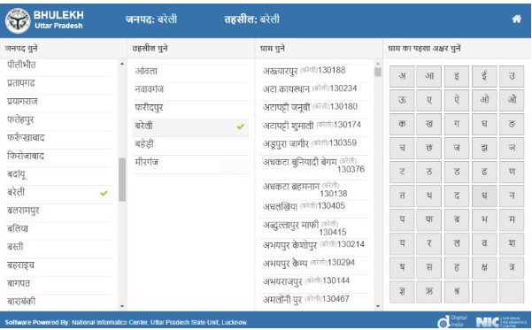 जैसे ही आप यूपी भूलेख की आधिकारिक वेबसाइट पर जाएंगे। वहां पर सबसे पहले उस जनपद का नाम सेलेक्ट करना है जहाँ की आप ऑनलाइन जमीन की जानकारी देखना चाहते है। फिर तहसील और ग्राम का नाम का चयन करना है।