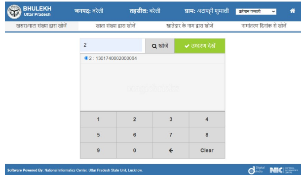 इन चारों विकल्प के द्वारा आप यूपी जमीन की जानकारी निकाल सकते है। इनमें से एक विकल्प खसरा/गाटा संख्या द्वारा खोजें को सेलेक्ट करें। फिर सर्च बॉक्स में जमीन का खसरा/गाटा संख्या दर्ज करके खोजें बटन पर क्लिक कर दे। जैसे नीचे चित्र में दिखाया गया है।