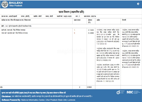 जैसे ही आप कैप्चा कोड वेरीफाई करेंगे, आपके द्वारा सेलेक्ट किये गए खसरा/गाटा संख्या का विवरण यानि खाता विवरण आपके सामने प्रदर्शित हो जाएगा। अब आप जमीन से सम्बंधित पूरी जानकारी चेक कर सकते है।