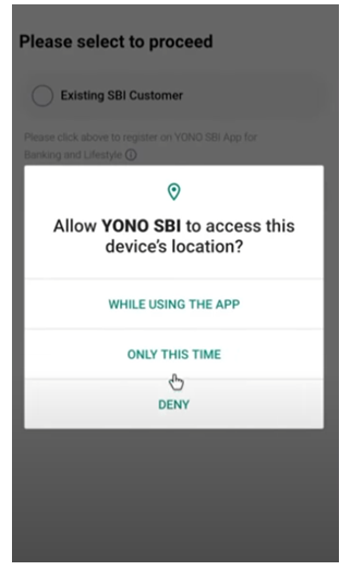 - एप्लीकेशन डाउनलोड करने के बाद इसे ओपन करे, एसबीआई योनो द्वारा आपसे मोबाइल में लोकेशन परमिशन के लिए पूछा जाएगा, जिसे आपको ‘Allow’ करना है |
