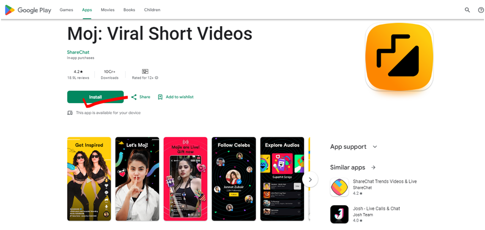 - सर्च करने के बाद आपके सामने बहुत सारे ऐप्स आ जाएंगे जिसमें सबसे ऊपर आपको Moj Short Video App के ऑप्शन पर क्लिक करना होगा।