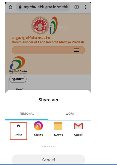 - भू नक्शे को प्रिंट करने के लिए यदि आपके पास प्रिंटर है तो Ctrl+P कुंजी दबाने के बाद के बाद प्रिंटर सेलेक्ट करना है और प्रिंट पर क्लिक कर देना। आपका भू नक्शा प्रिंट ही जायेगा। यदि आपके पास प्रिंटर नहीं है तो आपको भू नक्शे की फाइल को सेव कर लेना है और किसी CSC पर जाकर शेयर करके ऑपरेटर से प्रिंट करने के लिए कह देना है, वो आपके भू नक्शे को प्रिंट करके दे देगा।