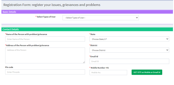 - Register Grievance पर क्लिक करते ही आपके सामनें एक फार्म ओपन होगा जिसमें पूछी गयी सभी जानकारी दर्ज कर Get OTP पर क्लिक करे |
