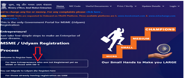 - होम पेज पर आपको Registration Here ने नीचे For New Entrepreneurs who are not Registered yet as MSME or those with EM-II का ऑप्शन पर क्लिक करना है।