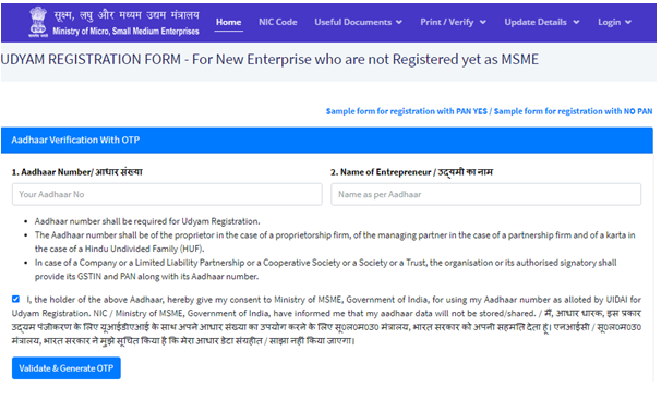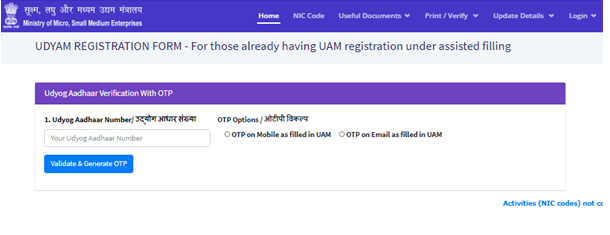 - इस ऑप्शन पर क्लिक करते ही आपके सामनें एक नया पेज ओपन होगा, जिसमें आधार नंबर और उदयमी का नाम लिखकर Validate & Generate OTP पर क्लिक करें |