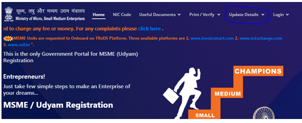 - अब होम पेज पर Update Details के अन्दर Update Udyam Registration क्लिक करना है |