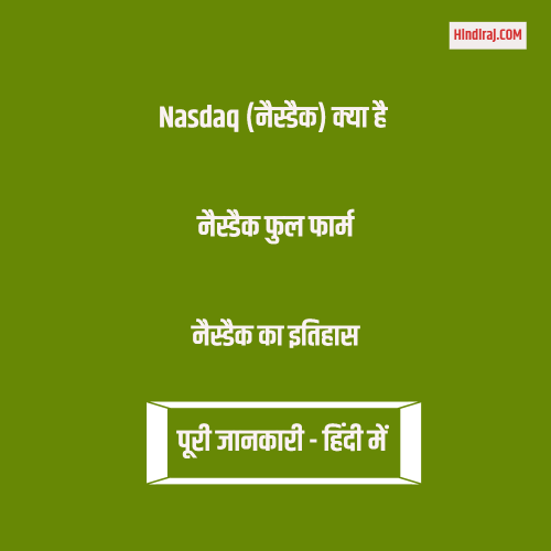 Nasdaq (नैस्डैक)का फुल फार्म “National Association of Securities Dealers Automated Quotations (नेशनल एसोसिएशन ऑफ़ सिक्योरिटीज डीलर्स ऑटोमेटेड कोटशन्स)” है | नैस्डैक दुनिया का सबसे बड़ा और सबसे पुराना इलेक्ट्रॉनिक स्टॉक मार्केट है |