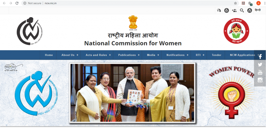 देश में महिलाओं को सुरक्षा देने के लिए राष्ट्रीय महिला आयोग ने एक वेबसाइट ncw.nic.in जारी कर रखी है। यह ऐसी वेबसाइट है, जो महिला अधिकारों, विभिन्न कानूनों और कृत्यों में न्याय दिलाने के विषय में जानकारी प्रदान करता है। एनसीडब्ल्यू (NCW) पोर्टल की सबसे ज्यादा ख़ास बात यह है कि इस पोर्टल के द्वारा महिलाएं ऑनलाइन ही अपनी शिकायत दर्ज करवा सकती है इसके अलावा ऑनलाइन शिकायत की स्थिति की भी जांच कर सकती है। महिलाओं के लिए इस सुविधाजनक पोर्टल का शुभारम्भ अध्यक्ष रेखा शर्मा द्वारा किया गया था |