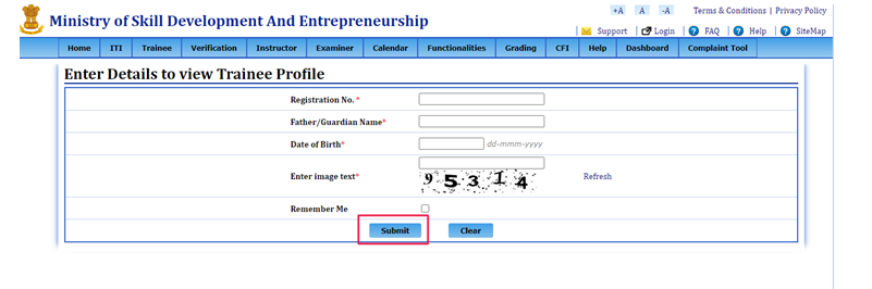 • अब आपको निश्चित जगह में रजिस्ट्रेशन नंबर, फादर का नाम, डेट ऑफ बर्थ इत्यादि जानकारियों को दर्ज करना है और उसके पश्चात सबमिट बटन पर क्लिक करना है।