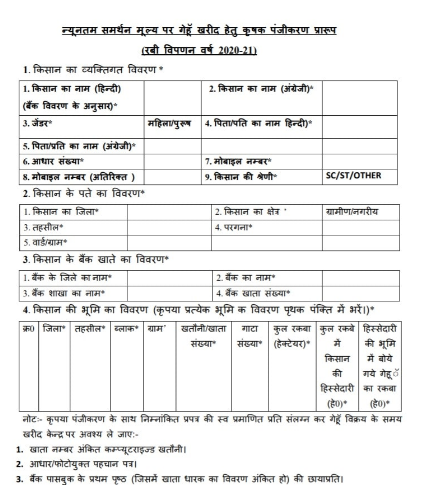 - किसानों को अपनी जमीन से संबंधित जानकारी के लिए खसरा-खतौनी, खसरा संख्या और जमीन का रकबा एवं गेहूँ का रकबा आदि देना आवश्यक है |