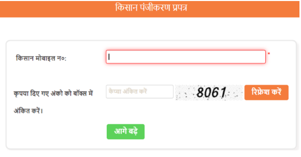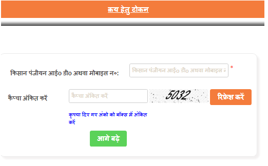 - सबसे पहले आपको लॉक के उपरांत टोकन बनाये के स्टेप पर क्लिक करना होगा । ऑप्शन पर क्लिक करने के बाद यहाँ पर किसान पंजीयन आईडी अथवा मोबाइल न०और कैप्चा अंकित करें भर कर ‘आगे बढ़े’ के बटन पर क्लिक करना है।