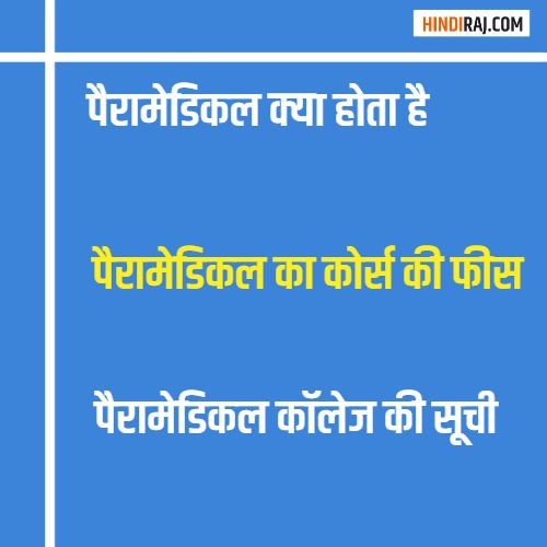 पैरामेडिकल एक बहुत ही अच्छा कोर्स होता है, जिसे करने के बाद विधार्थी अपना भविष्य बना सकते है | यदि आप भी मेडिकल से संबंधित पेरामेडिकल का कोर्स करने में दिलचस्पी रखते है, तो इस लेख में आपको पेरामेडिकल कोर्स से जुड़ी महत्वपूर्ण जानकारी जैसे पैरामेडिकल क्या होता है, तथा पैरामेडिकल कोर्स की फ़ीस, और पैरामेडिकल कॉलेज लिस्ट की जानकारी दी जा रही है |