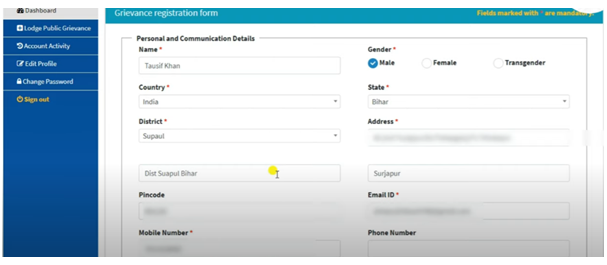- अब आपके सामनें एक फार्म ओपन होगा, जिसमें पूछी गयी जानकारी के साथ ही अपनी शिकायत का विवरण 4000 शब्दों में लिखकर Submit पर क्लिक करना है |