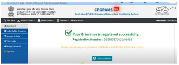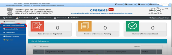 - लॉग इन करते ही आपके सामनें Dashboard ओपन होगा, यहाँ आपको LodgePublic Grievance पर क्लिक करना है |