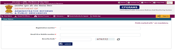 अब यहाँ पर आपको अपनी शिकायत का Registration number, Email id, Mobile number और Security Code दर्ज कर Submit पर क्लिक करे |