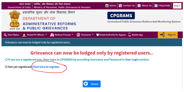 - रजिस्ट्रेशन करनें के लिए सबसे पहले आपको pgportal.gov.in ओपन करना है, आप इस लिंक https://pgportal.gov.in/Home/LodgeGrievance से डायरेक्ट ओपन कर सकते है |