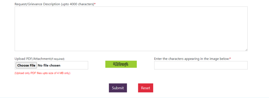 - अगर आपके पास कोई पीडीऍफ़ है तो आप उसे अपलोड करें, वरनो ज़रूरी नहीं है। उसके बाद आप निचे दिए गए कैप्चा कोड को कैप्चा बॉक्स में दर्ज करके सबमिट बटन पर क्लिक कर दे।